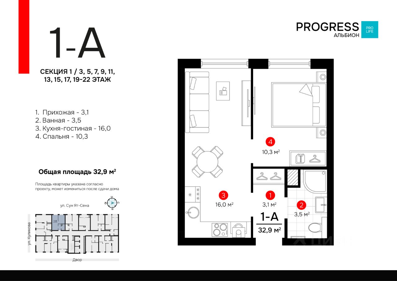 Общая площадь32,9 м2