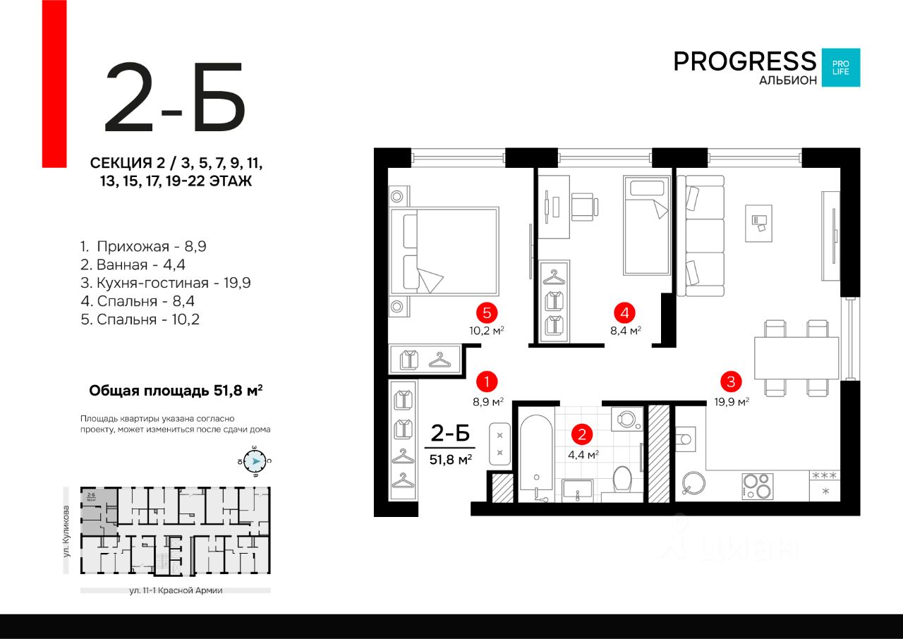 ''PROGRESS Альбион'' находится на улице Куликова в развивающемся Кировском районе. Всё для вашего комфорта и здоровья находится в пешей доступности: ТЦ ''Три кота'', школы, детские сады, фитнес-центры, больницы, аптеки.