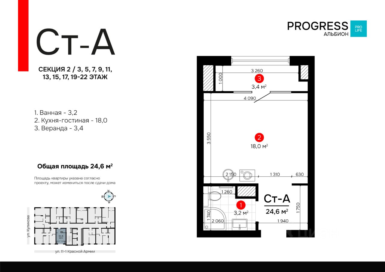 ''PROGRESS Альбион'' находится на улице Куликова в развивающемся Кировском районе. Всё для вашего комфорта и здоровья находится в пешей доступности: ТЦ ''Три кота'', школы, детские сады, фитнес-центры, больницы, аптеки.