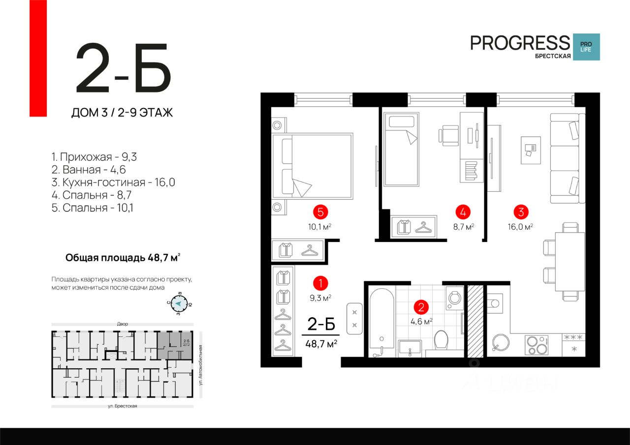 Квартал ''PROGRESS Брестская'' расположен в микрорайоне Автогородок на улице Брестская. Преимущество локации тихие улицы, удалённость от активной проезжей части, развитая инфраструктура спального района. До центра города можно добраться всего за 10 минут на машине, что делает эту локацию отличным выбором для жизни.
