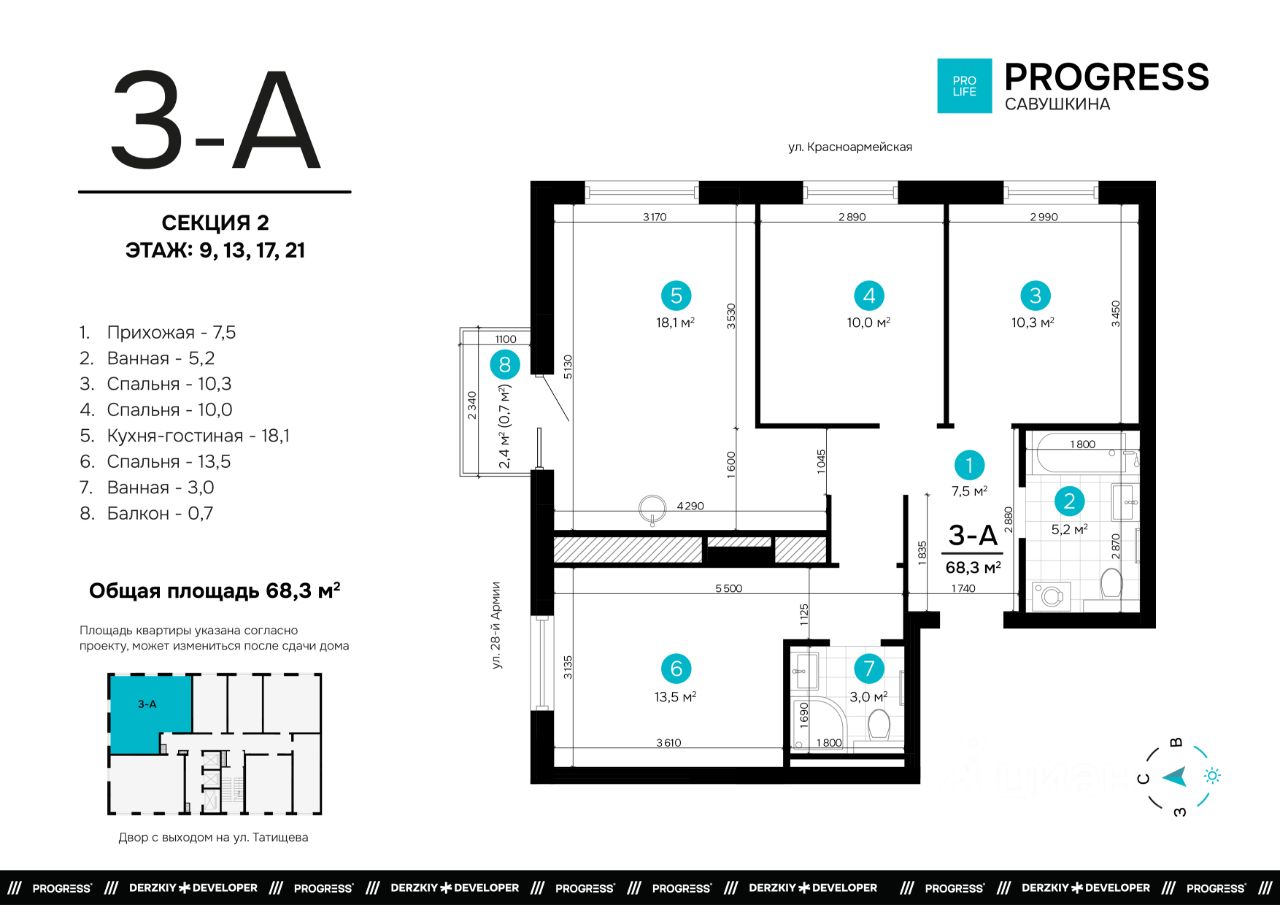 ''PROGRESS Савушкина'' для тех, кто открыто смотрит в будущее. Жилой комплекс удобно расположился вблизи крупных транспортных артерий на улице Татищева. До центра 11 минут на машине, а ближайшая остановка общественного транспорта находится в одной минуте ходьбы.