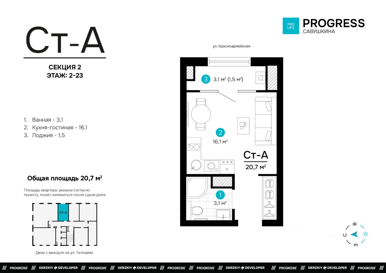 ''PROGRESS Савушкина'' для тех, кто открыто смотрит в будущее. Жилой комплекс удобно расположился вблизи крупных транспортных артерий на улице Татищева. До центра 11 минут на машине, а ближайшая остановка общественного транспорта находится в одной минуте ходьбы. Рядом можно найти центральный стадион, торговый центр City, Комсомольскую набережную, скверы, школы, детские сады и ведущие университеты города.