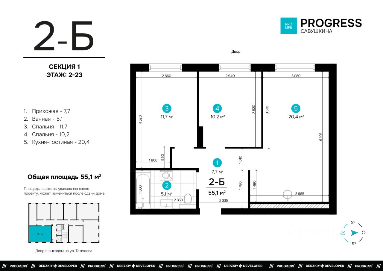 ''PROGRESS Савушкина'' для тех, кто открыто смотрит в будущее. Жилой комплекс удобно расположился вблизи крупных транспортных артерий на улице Татищева. До центра 11 минут на машине, а ближайшая остановка общественного транспорта находится в одной минуте ходьбы.