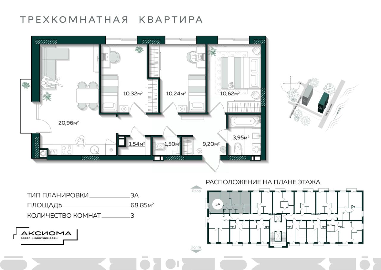 Продаётся 3-комнатная квартира в строящемся доме (Дом 2), срок сдачи: I-кв. 2026, общей площадью 68.85 кв.м., на 5 этаже.