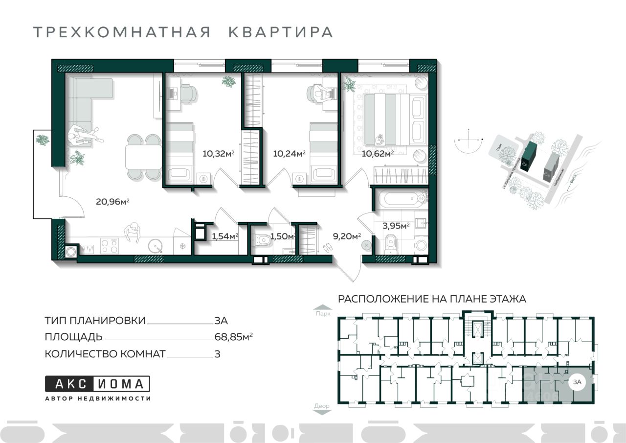 Продаётся 3-комнатная квартира в строящемся доме (Дом 1), срок сдачи: I-кв. 2026, общей площадью 68.85 кв.м., на 4 этаже.