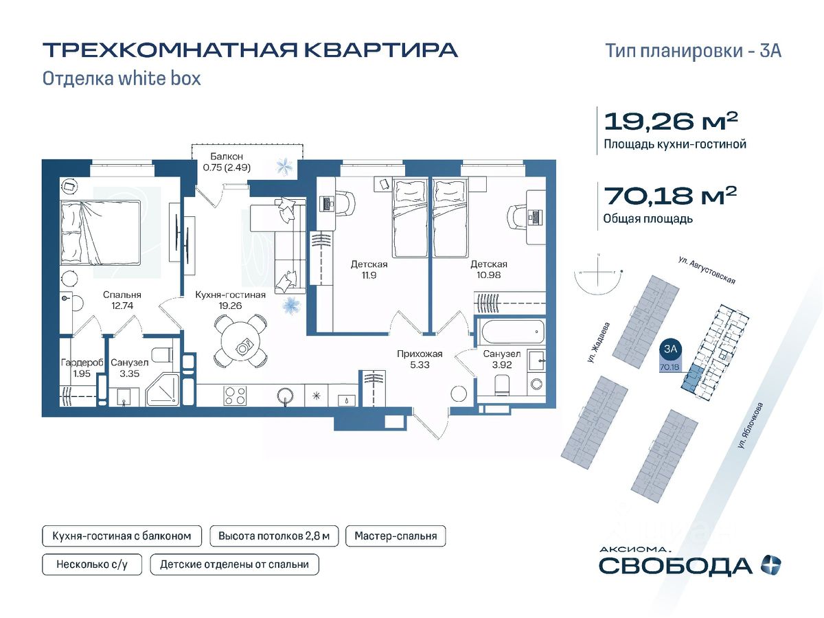 Продаётся 3-комнатная квартира в строящемся доме (Дом 1), срок сдачи: I-кв. 2029, общей площадью 69.43 кв.м., на 15 этаже. Новый жилой комплекс ''Аксиома. Свобода плюс'' от застройщика ''Аксиома'' расположен по адресу: Россия, Астрахань, Августовская улица