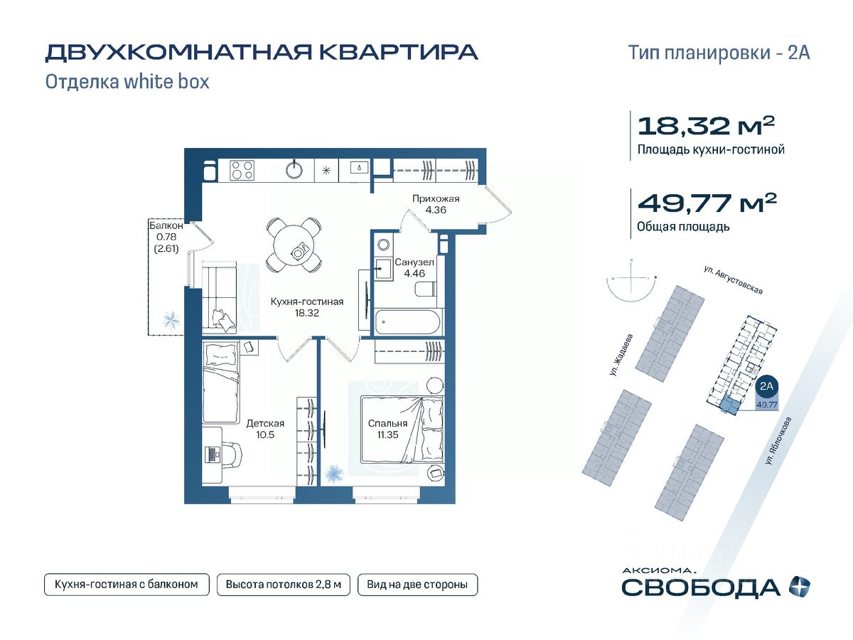 Продаётся 2-комнатная квартира в строящемся доме (Дом 1), срок сдачи: I-кв. 2029, общей площадью 49.77 кв.м., на 8 этаже. Новый жилой комплекс ''Аксиома. Свобода плюс'' от застройщика ''Аксиома'' расположен по адресу: Россия, Астрахань, Августовская улица