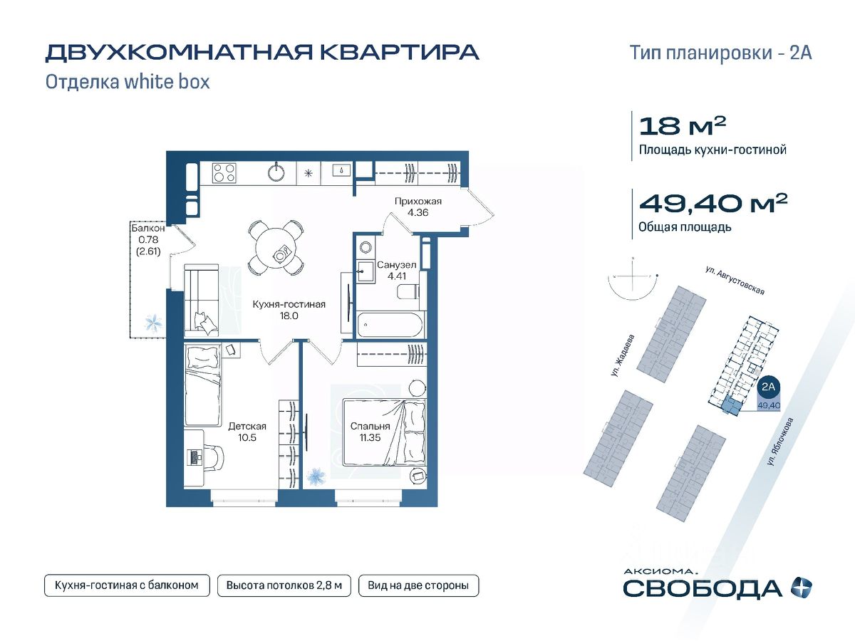 Продаётся 2-комнатная квартира в строящемся доме (Дом 1), срок сдачи: I-кв. 2029, общей площадью 49.4 кв.м., на 13 этаже. Новый жилой комплекс ''Аксиома. Свобода плюс'' от застройщика ''Аксиома'' расположен по адресу: Россия, Астрахань, Августовская улица