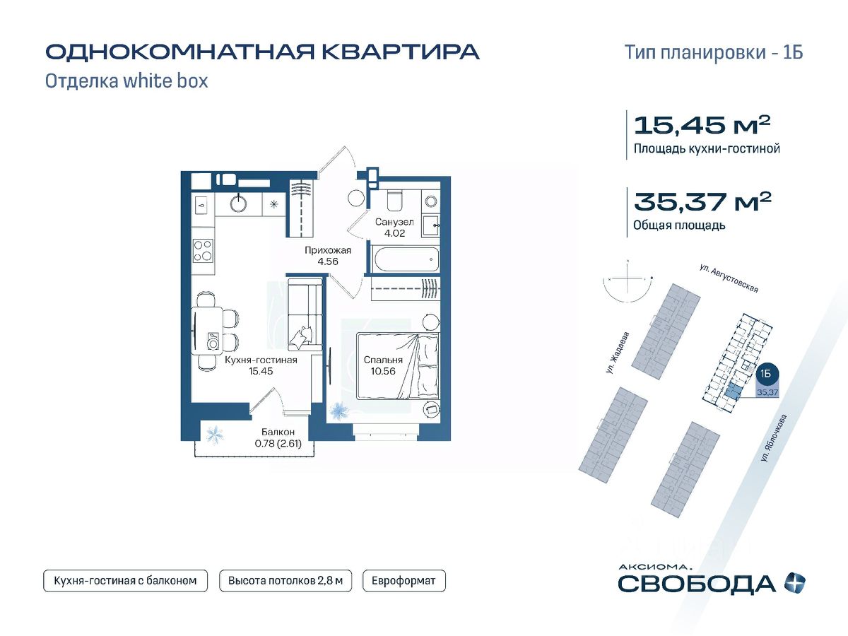 Продаётся 1-комнатная квартира в строящемся доме (Дом 1), срок сдачи: I-кв. 2029, общей площадью 35.37 кв.м., на 13 этаже. Новый жилой комплекс ''Аксиома. Свобода плюс'' от застройщика ''Аксиома'' расположен по адресу: Россия, Астрахань, Августовская улица