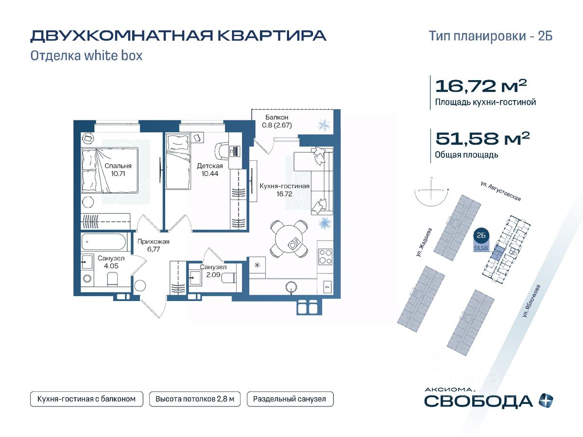 Продаётся 2-комнатная квартира в строящемся доме (Дом 1), срок сдачи: I-кв. 2029, общей площадью 50.78 кв.м., на 10 этаже. Новый жилой комплекс ''Аксиома. Свобода плюс'' от застройщика ''Аксиома'' расположен по адресу: Россия, Астрахань, Августовская улица