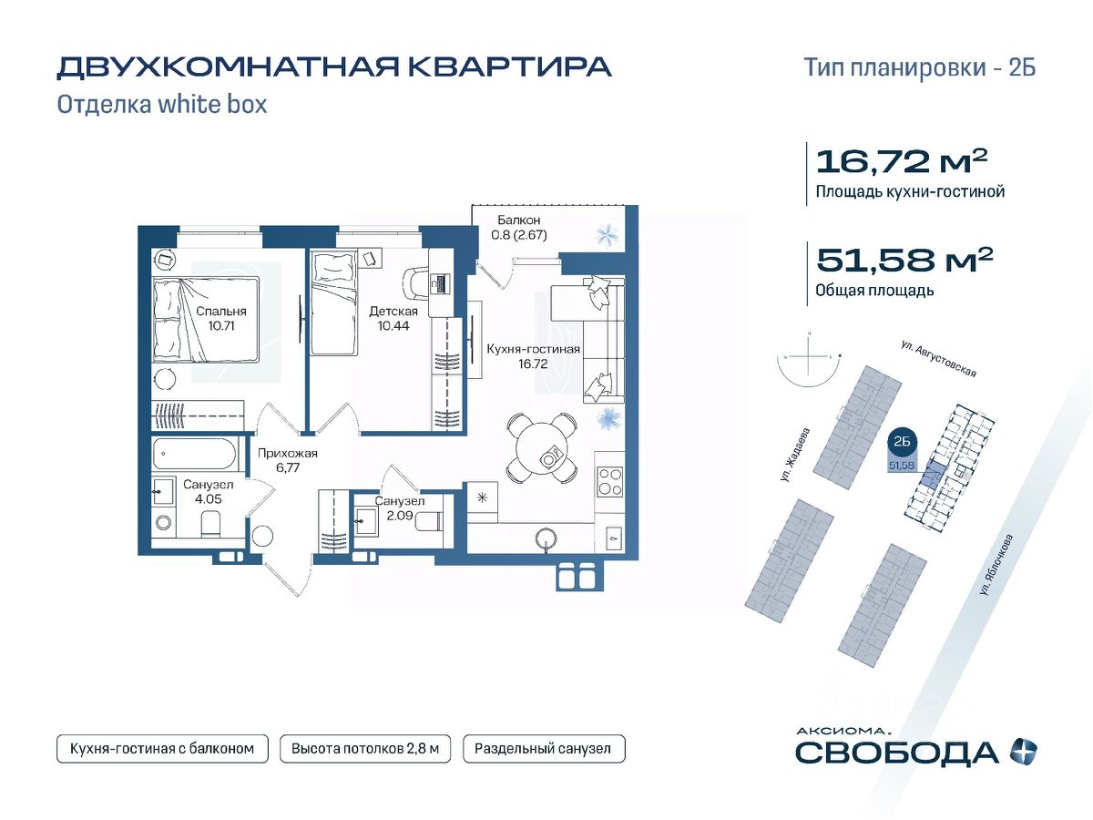 Продаётся 2-комнатная квартира в строящемся доме (Дом 1), срок сдачи: I-кв. 2029, общей площадью 50.78 кв.м., на 11 этаже. Новый жилой комплекс ''Аксиома. Свобода плюс'' от застройщика ''Аксиома'' расположен по адресу: Россия, Астрахань, Августовская улица