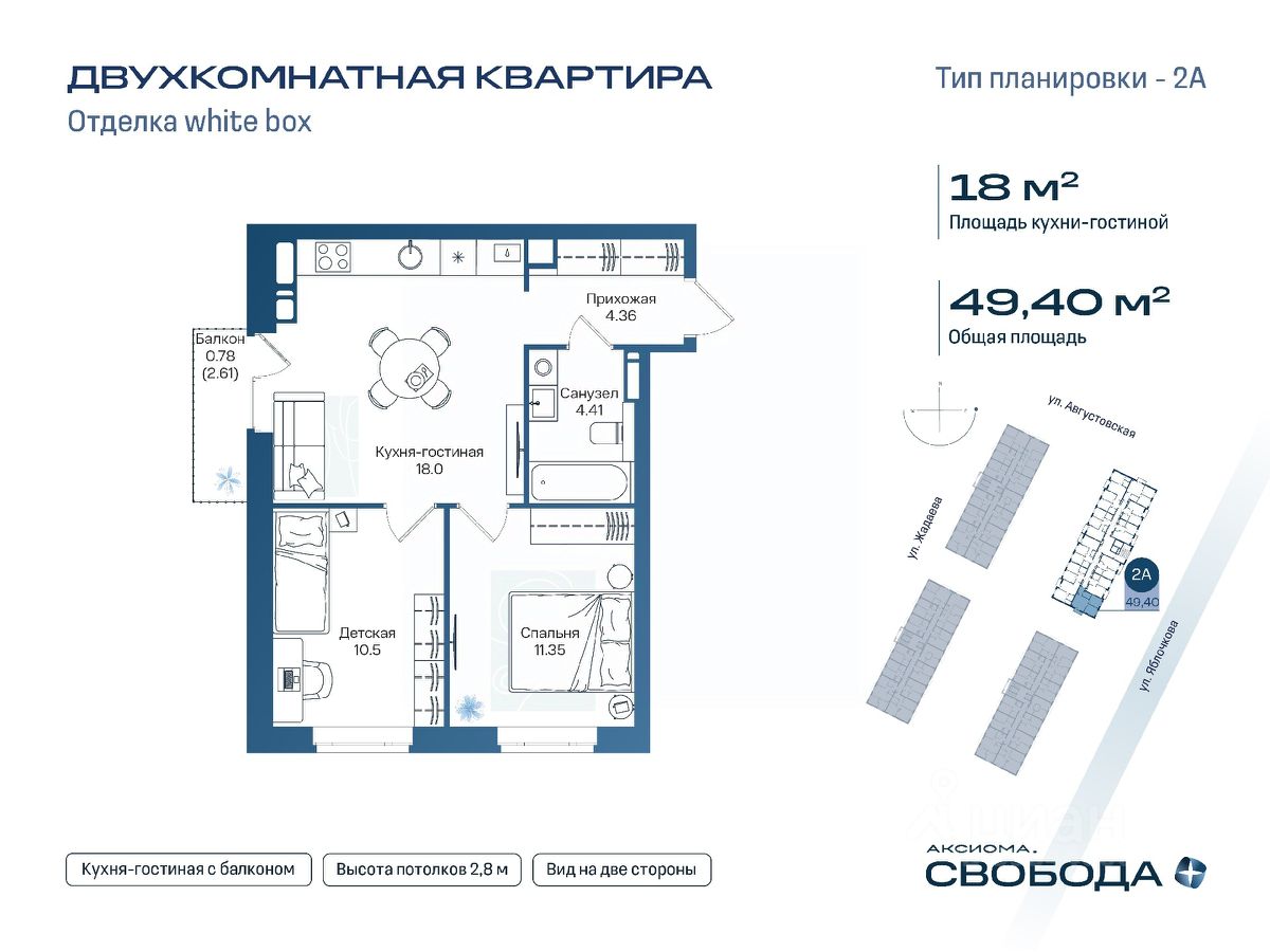 Продаётся 2-комнатная квартира в строящемся доме (Дом 1), срок сдачи: I-кв. 2029, общей площадью 49.4 кв.м., на 12 этаже. Новый жилой комплекс ''Аксиома. Свобода плюс'' от застройщика ''Аксиома'' расположен по адресу: Россия, Астрахань, Августовская улица