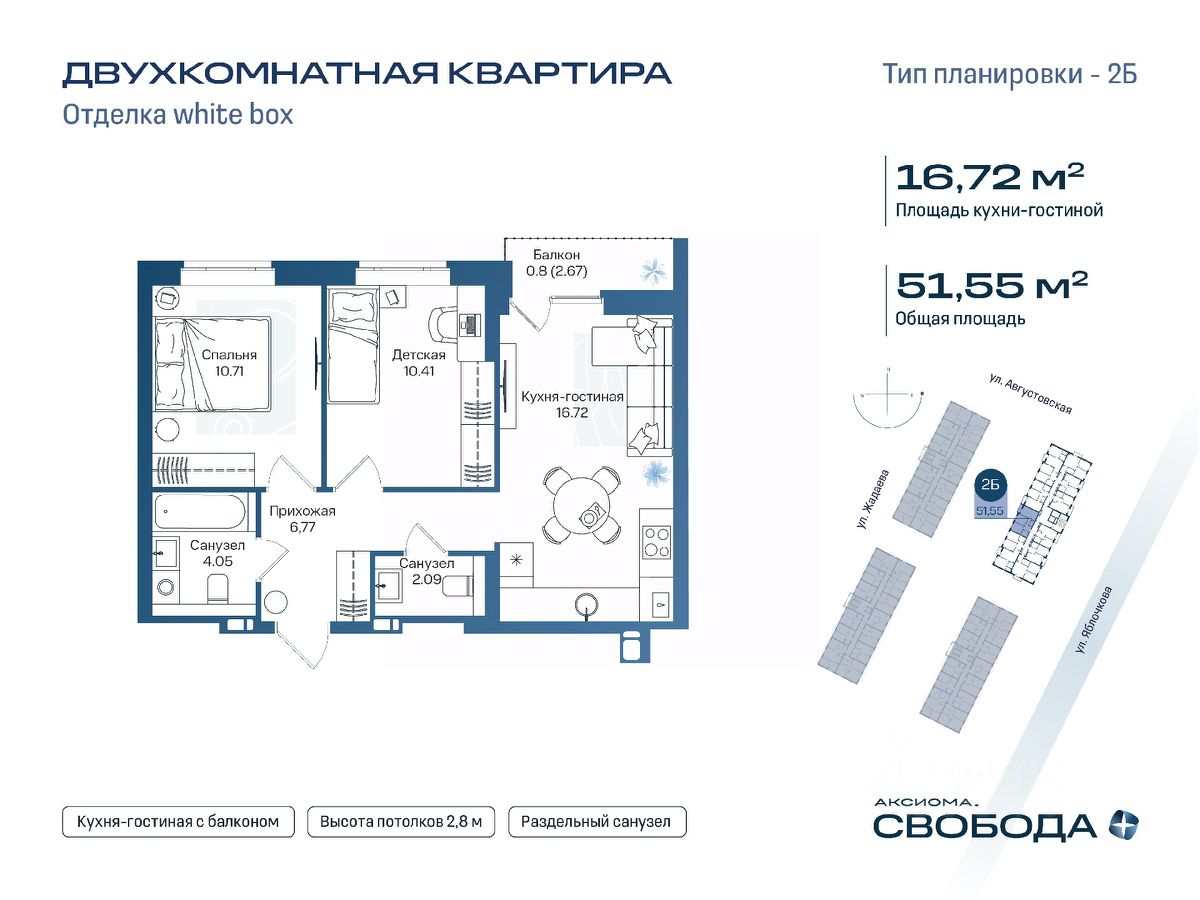 Продаётся 2-комнатная квартира в строящемся доме (Дом 1), срок сдачи: I-кв. 2029, общей площадью 51.55 кв.м., на 12 этаже. Новый жилой комплекс ''Аксиома. Свобода плюс'' от застройщика ''Аксиома'' расположен по адресу: Россия, Астрахань, Августовская улица