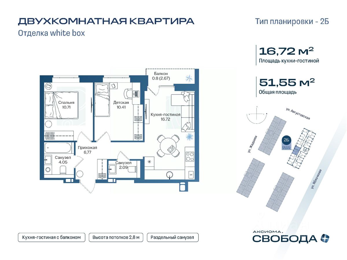 Продаётся 2-комнатная квартира в строящемся доме (Дом 1), срок сдачи: I-кв. 2029, общей площадью 51.55 кв.м., на 17 этаже. Новый жилой комплекс ''Аксиома. Свобода плюс'' от застройщика ''Аксиома'' расположен по адресу: Россия, Астрахань, Августовская улица