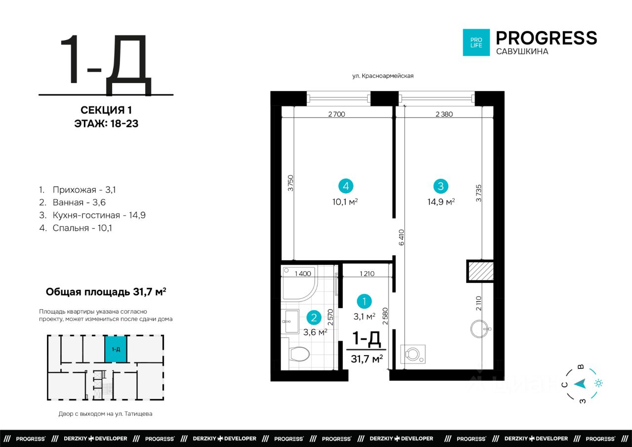 ''ПРОГРЕСС Савушкина'' для тех, кто открыто смотрит в будущее. Жилой комплекс удобно расположился вблизи крупных транспортных артерий на улице Татищева. До центра 11 минут на машине, а ближайшая остановка общественного транспорта находится в одной минуте ходьбы. Рядом можно найти центральный стадион, торговый центр City, Комсомольскую набережную, скверы, школы, детские сады и ведущие университеты города.