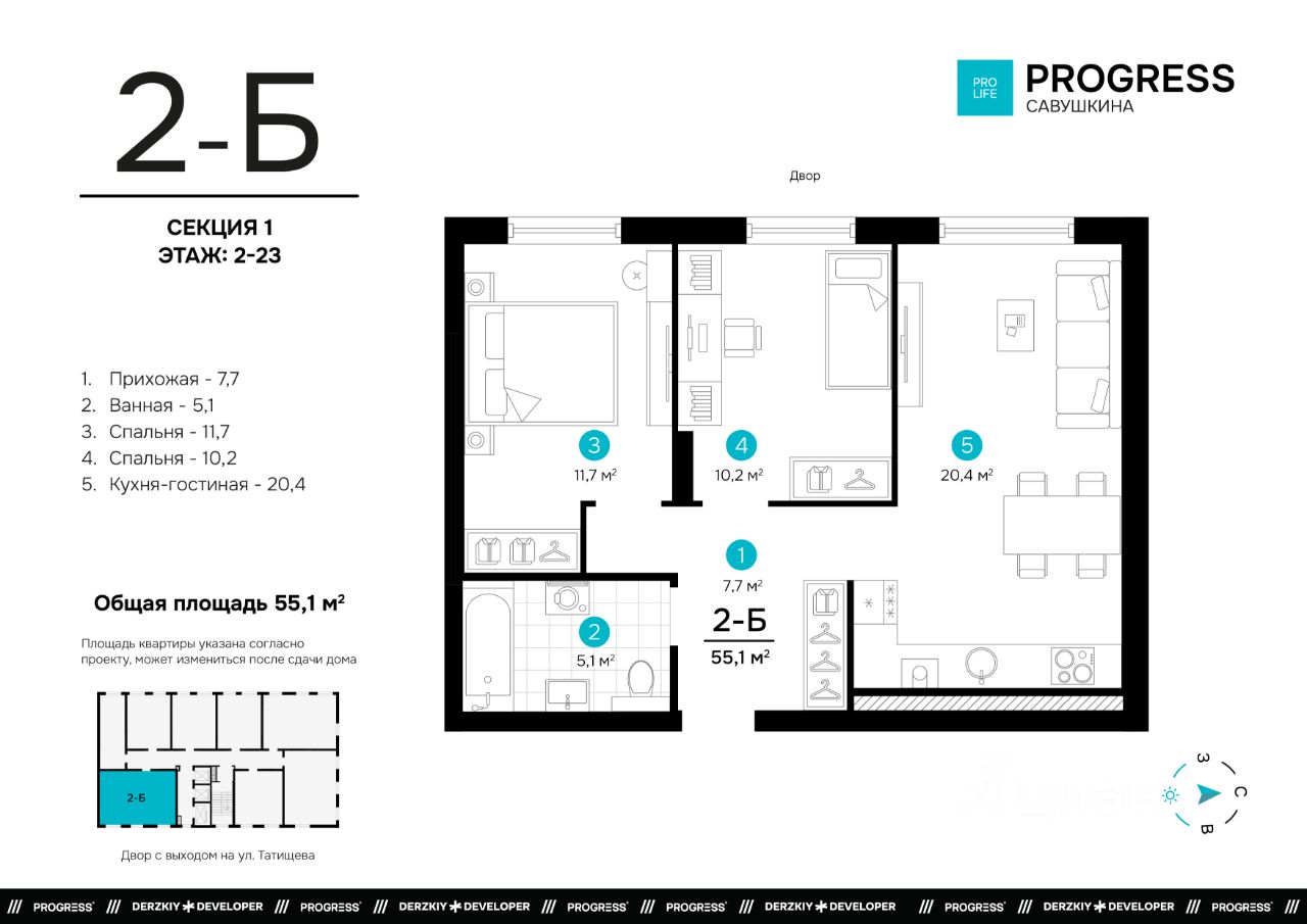 ''ПРОГРЕСС Савушкина'' для тех, кто открыто смотрит в будущее. Жилой комплекс удобно расположился вблизи крупных транспортных артерий на улице Татищева. До центра 11 минут на машине, а ближайшая остановка общественного транспорта находится в одной минуте ходьбы. Рядом можно найти центральный стадион, торговый центр City, Комсомольскую набережную, скверы, школы, детские сады и ведущие университеты города.