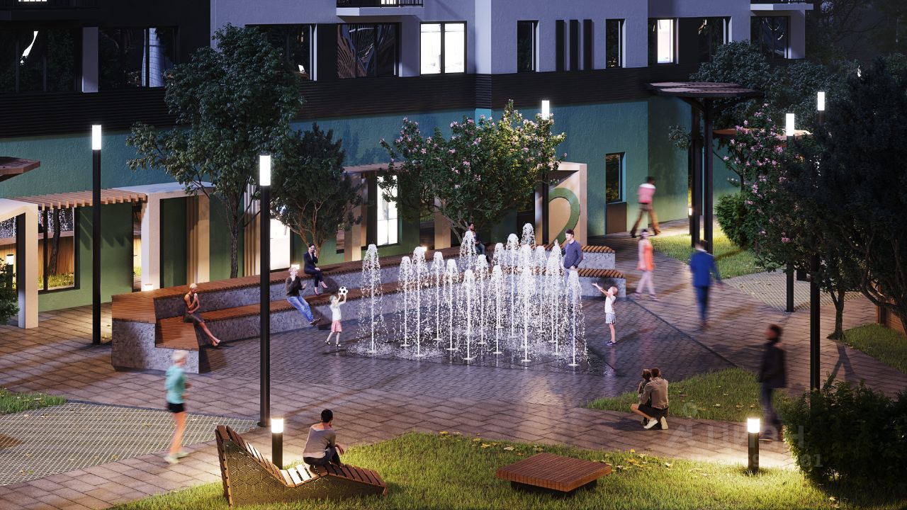 Амфитеатр с контактным фонтаном настоящий бриллиант в самом сердце двора. Центр притяжения всех жителей комплекса выполнен в форме этого драгоценного камня. Рядом расположились комфортные relax-зоны, где можно зарядиться энергией перед новым днём. Для любителей активного отдыха создано workout-пространство. А на детских площадках для разных возрастов каждый ребёнок может раскрыть свой потенциал и обрести новых друзей.