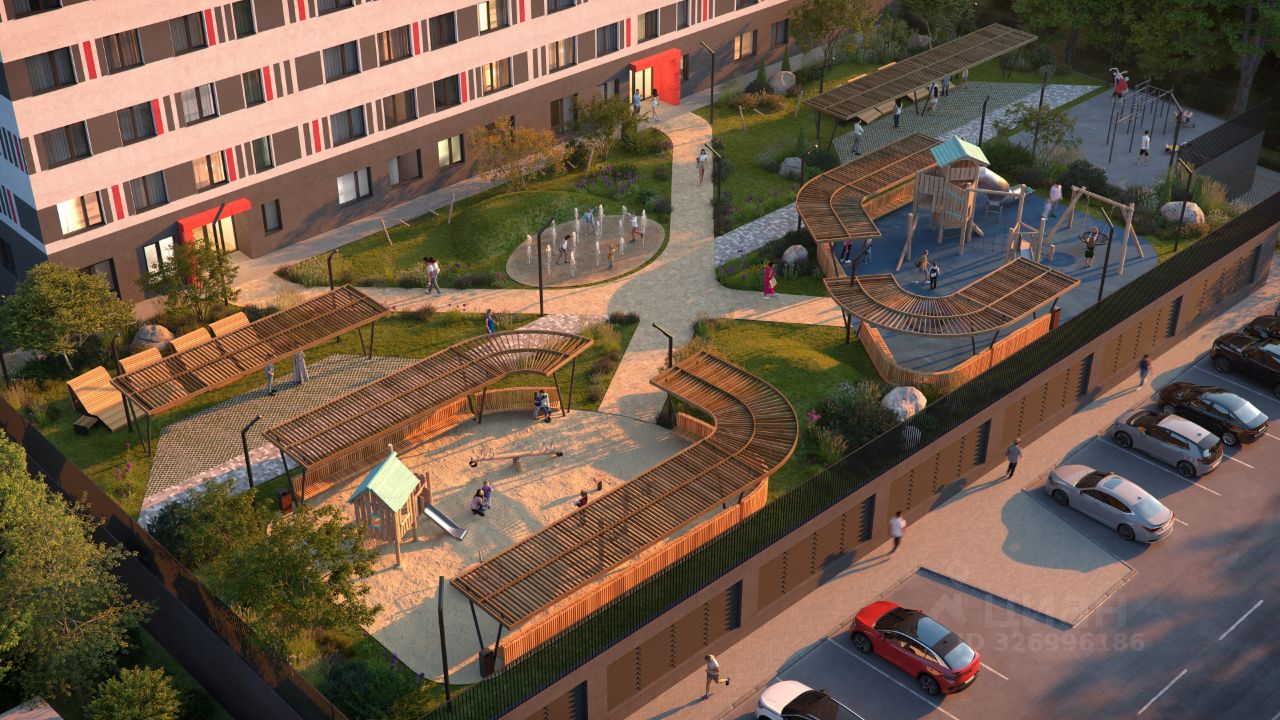 Большой зелёный двор, словно в настоящем парке: пешеходные дорожки, множество шезлонгов под навесом, детские игровые площадки для разных возрастов, многофункциональная спортивная зона с безопасным покрытием и контактный фонтан в самом центре.