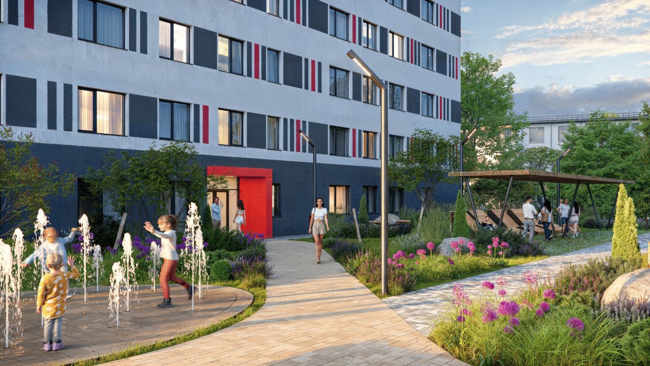 Большой зелёный двор, словно в настоящем парке: пешеходные дорожки, множество шезлонгов под навесом, детские игровые площадки для разных возрастов, многофункциональная спортивная зона с безопасным покрытием и контактный фонтан в самом центре.